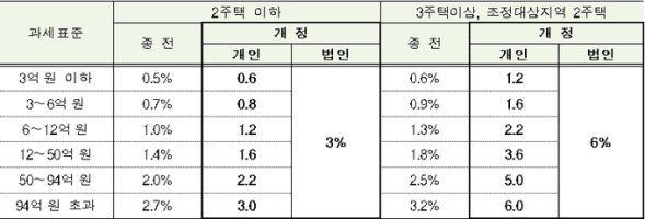 조정대상지역의 경우 2주택에 대해서는 기본공제 인상과 함께 중과세율(1.2~6.0%)이 아닌 0.5~2.7%의 일반세율을 적용해 세 부담이 크게 줄어든다.